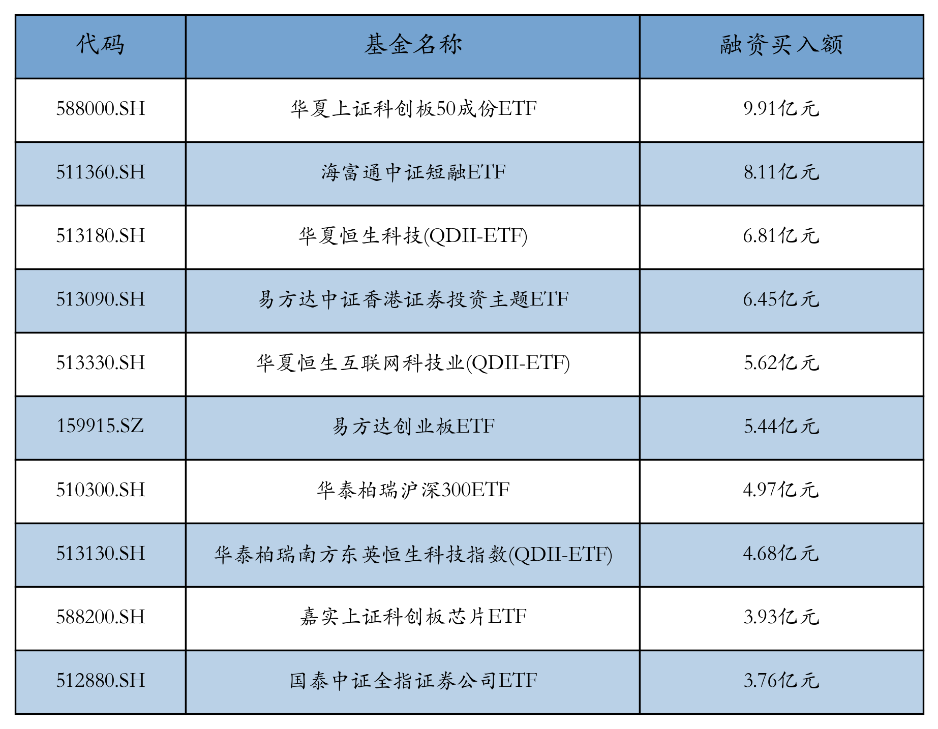 11月22日ETF融资买入额前三位分别为:华夏上证科创板50成份ETF(9.91亿元)、海富通中证短融ETF(8.11亿元)和华夏恒生科技(QDII-ETF)(6.81亿元),前10具体见下表: