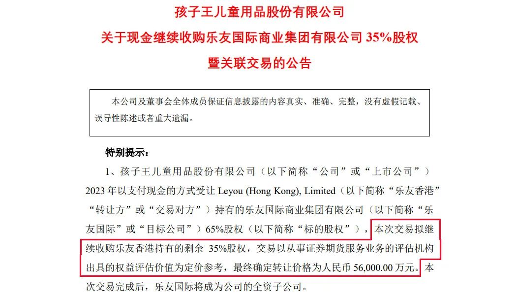 本次交易,乐友国际35%股权的评估值为5.72亿元,双方协商最终交易价格为5.6亿元。