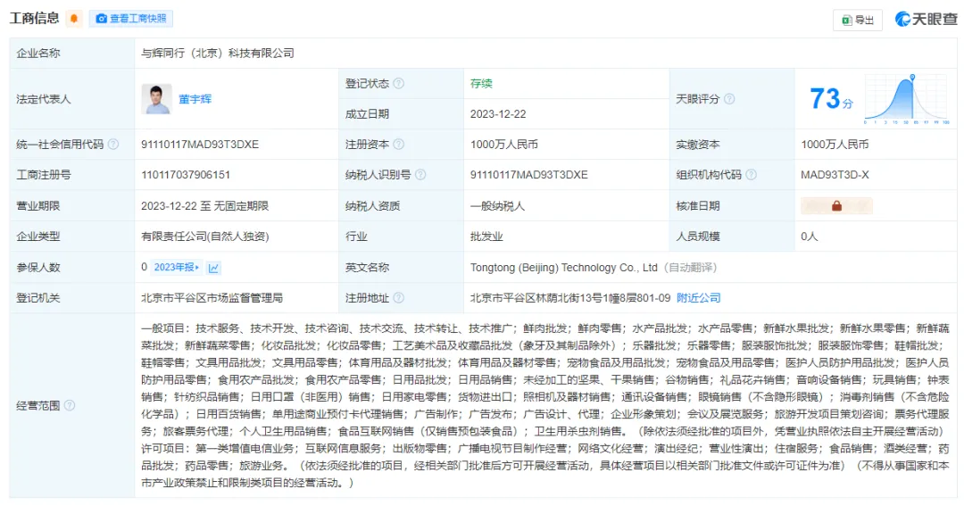 该公司成立于2023年12月,法定代表人为董宇辉,注册资本1000万人民币,由董宇辉全资持股。