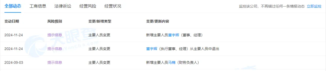 天眼查App显示,11月24日,与辉同行(北京)科技有限公司发生工商变更,董宇辉由执行董事、经理变更为董事、经理。