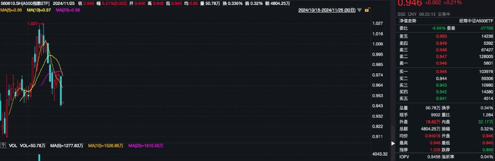 相关ETF方面,A500指数ETF(560610)高开高走,截至发稿涨0.21%,成交额超4800万元,早盘交投活跃,溢折率0.04%,盘中频现溢价交易。成分股中,中公教育涨超8%,明阳智能涨超7%,国轩高科、盛新锂能、恩捷股份、岩山科技、格林美等跟涨;蔚蓝锂芯跌超7%,上海电气、四川长虹、中兵红箭、航景科技等跟跌。