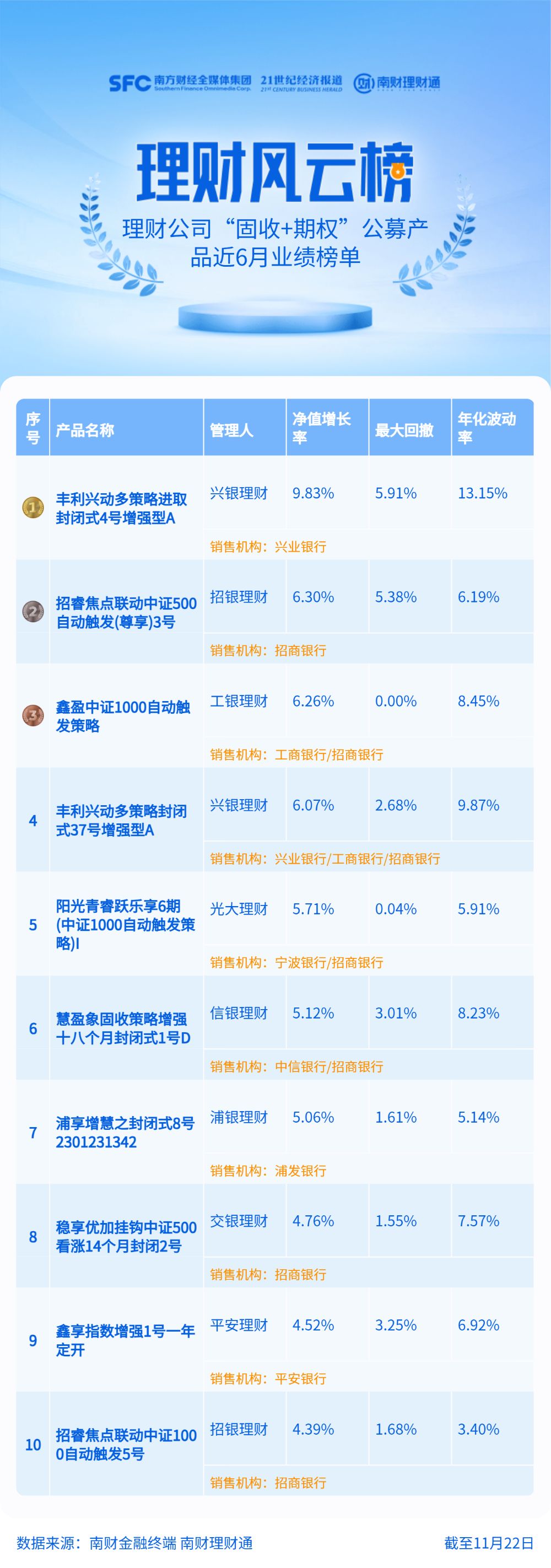 兴银理财“丰利兴动多策略进取封闭式4号增强型A”、招银理财“招睿焦点联动中证500自动触发(尊享)3号”和工银理财“鑫盈中证1000自动触发策略”位列前三,近6月净值增长率分别为9.83%、6.3%和6.26%。