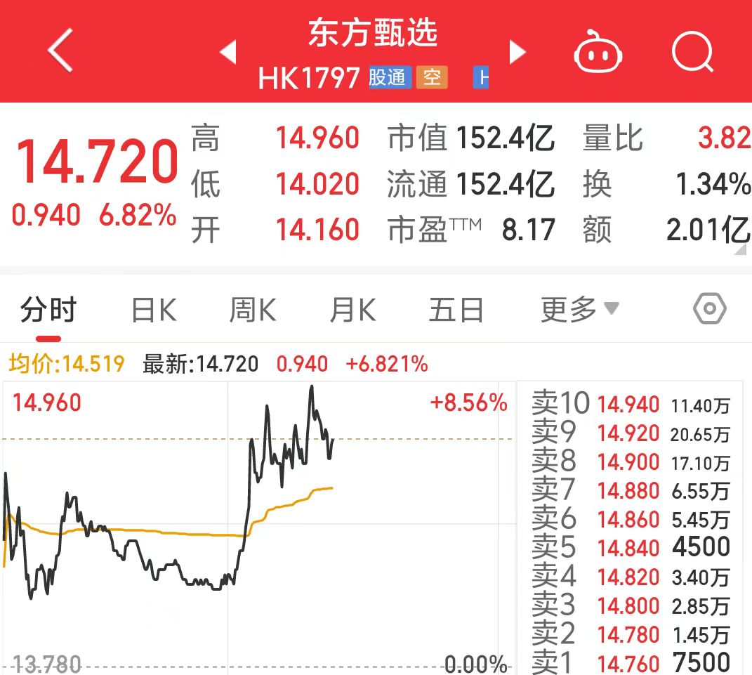 11月25日,东方甄选(01797.HK)盘中一度涨超8%,截至14时8分,涨6.82%,报14.72港元/股。消息面上,11月24日下午,时隔近一年未开播的孙东旭(东方小孙)现身东方甄选直播间。