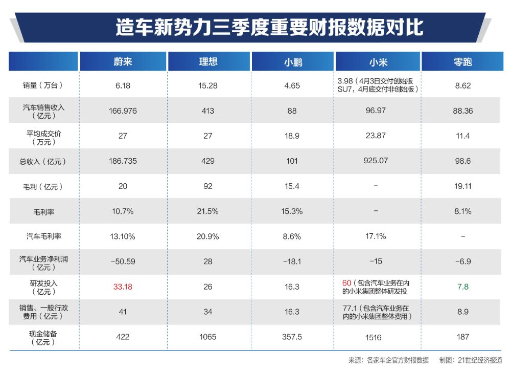 理想、蔚来、小鹏、零跑以及小米五家造车新势力企业,先后披露了第三季度财报数据。
