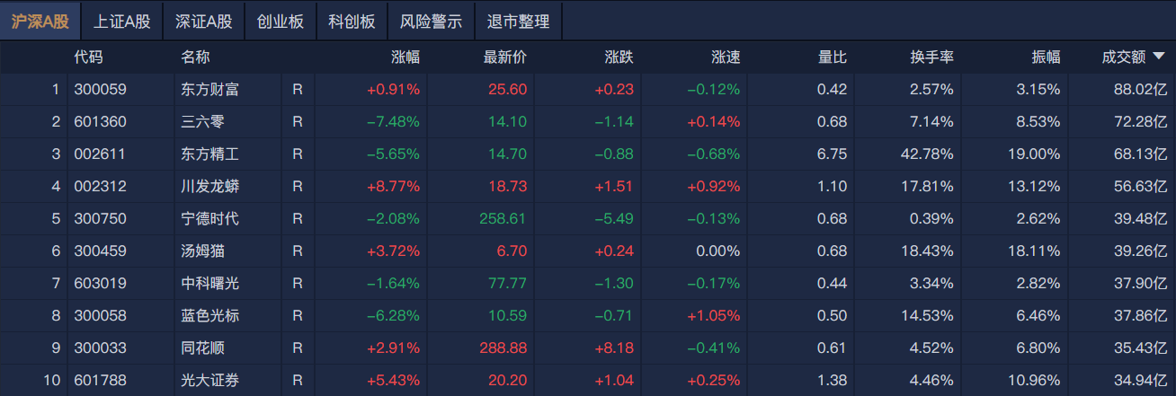 沪深两市半日成交额8417亿元,较上个交易日同期缩量882亿元。南财金融终端显示,个股方面,东方财富半日成交额近90亿元居首,三六零、东方精工、川发龙蟒成交额靠前。
