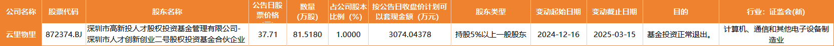 公告显示,云里物里的持股5%以上股东——深圳市高新投人才股权投资基金管理有限公司-深圳市人才创新创业二号股权投资基金合伙企业(有限合伙)(以下简称“高新投人才基金”),计划减持不超过815180股,减持比例不超过公司总股本的1%。此次减持的股份来源为北交所上市前取得的股份。