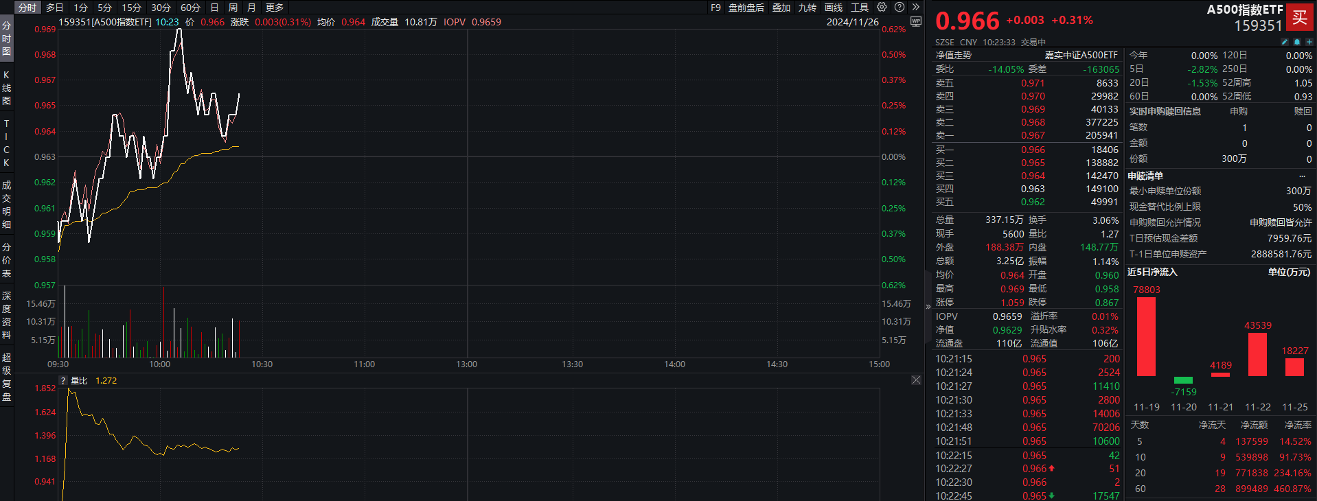相关ETF方面,A500指数ETF(159351)涨0.31%,成交额超3亿元,换手率超3%,早盘交投活跃,溢折率0.01%,盘中频现溢价交易。成分股中,AI应用概念股早盘持续走强,IP经济、传媒影视等方向领涨。成分股中,利欧股份、奥飞娱乐、岩山科技涨停,三态股份、巨星科技、光线传媒涨超6%,万达电影、汤姆猫、华策影视等多股跟涨。