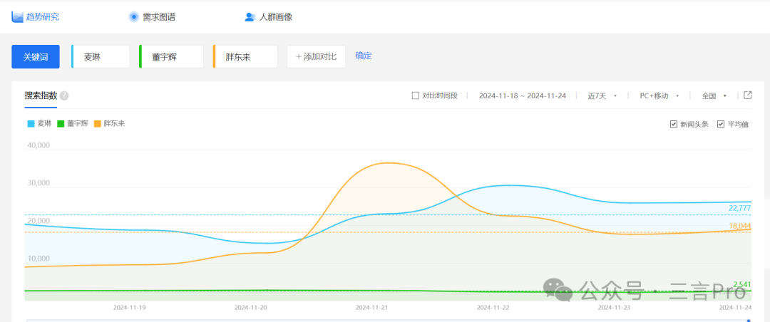 近7天,麦琳的搜索指数都非常高,均值都在20000以上,作为比对,董宇辉的搜索指数均值仅为2500左右。