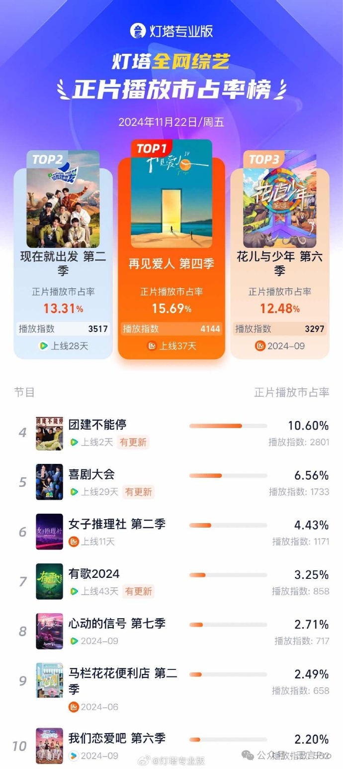 灯塔专业版数据显示,11月22日灯塔全网正片播放市占·综艺榜,《再见爱人 第四季》 以单日市占率16.68%获得冠军。
