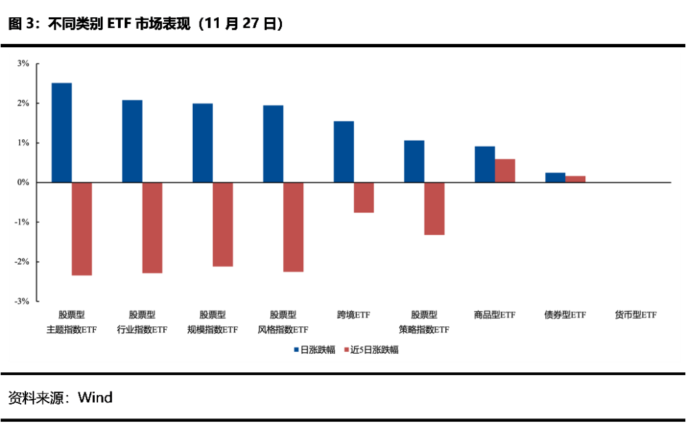 根据ETF基金的投资范围,将ETF基金划分为股票型规模指数ETF、股票型行业指数ETF、股票型策略指数ETF、股票型风格指数ETF、股票型主题指数ETF、债券型ETF、商品型ETF、货币型ETF、跨境ETF,今日股票型主题指数ETF表现最优,该类ETF的加权平均涨跌幅为2.51%;货币型ETF的表现最差,该类ETF的加权平均涨跌幅为0.00%。