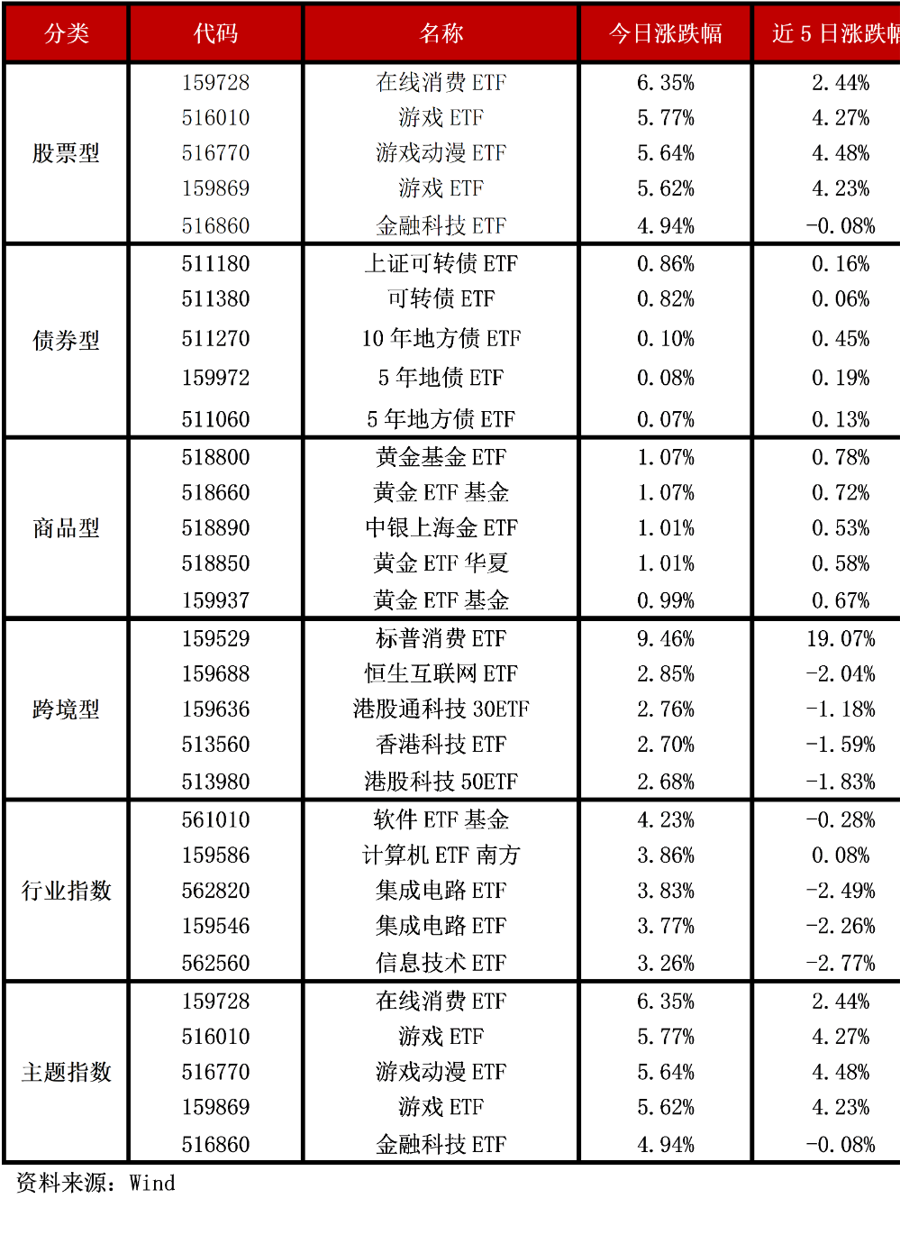 从不同投资种类、行业、主题的ETF产品中找出今日走势行情排名前5的ETF基金,根据Wind数据,今日涨幅靠前的ETF产品如下表所示。股票型ETF中涨幅最高的3只ETF产品分别为在线消费ETF(159728)、游戏ETF(516010)、游戏动漫ETF(516770),今日收益率分别为6.35%、5.77%和5.64%。