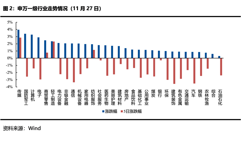 统计全部申万一级行业今日涨跌幅情况,传媒、国防军工、计算机今日走势排名靠前,日涨跌幅分别为3.96%、3.4%和3.28%,农林牧渔、综合、石油石化的走势排名靠后,日涨跌幅分别是0.76%、0.60%和0.30%;近5个交易日传媒、轻工制造、纺织服饰的走势排名靠前,近5日涨跌幅分别为2.87%、2.32%和1.16%,通信、汽车、建筑装饰行业的走势排名靠后,近5日涨跌幅分别为-3.36%、-3.52%和-3.58%。