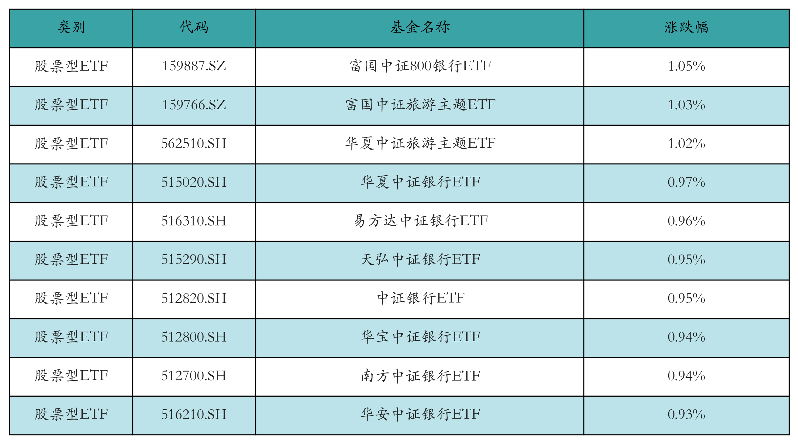 昨日股票型ETF涨幅最高的3支ETF及其收益率分别为:富国中证800银行ETF(1.05%)、富国中证旅游主题ETF(1.03%)、华夏中证旅游主题ETF(1.02%)。涨幅前10详情见下表: