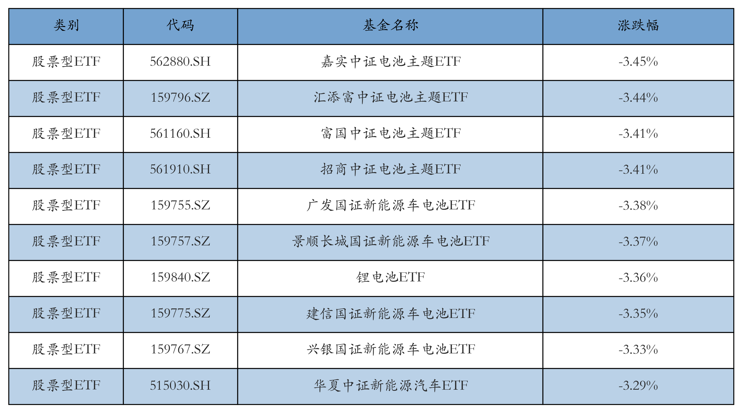 昨日股票型ETF跌幅最大的3支ETF及其收益率分别为:嘉实中证电池主题ETF(-3.45%)、汇添富中证电池主题ETF(-3.44%)、富国中证电池主题ETF(-3.41%)。跌幅前10详情见下表: