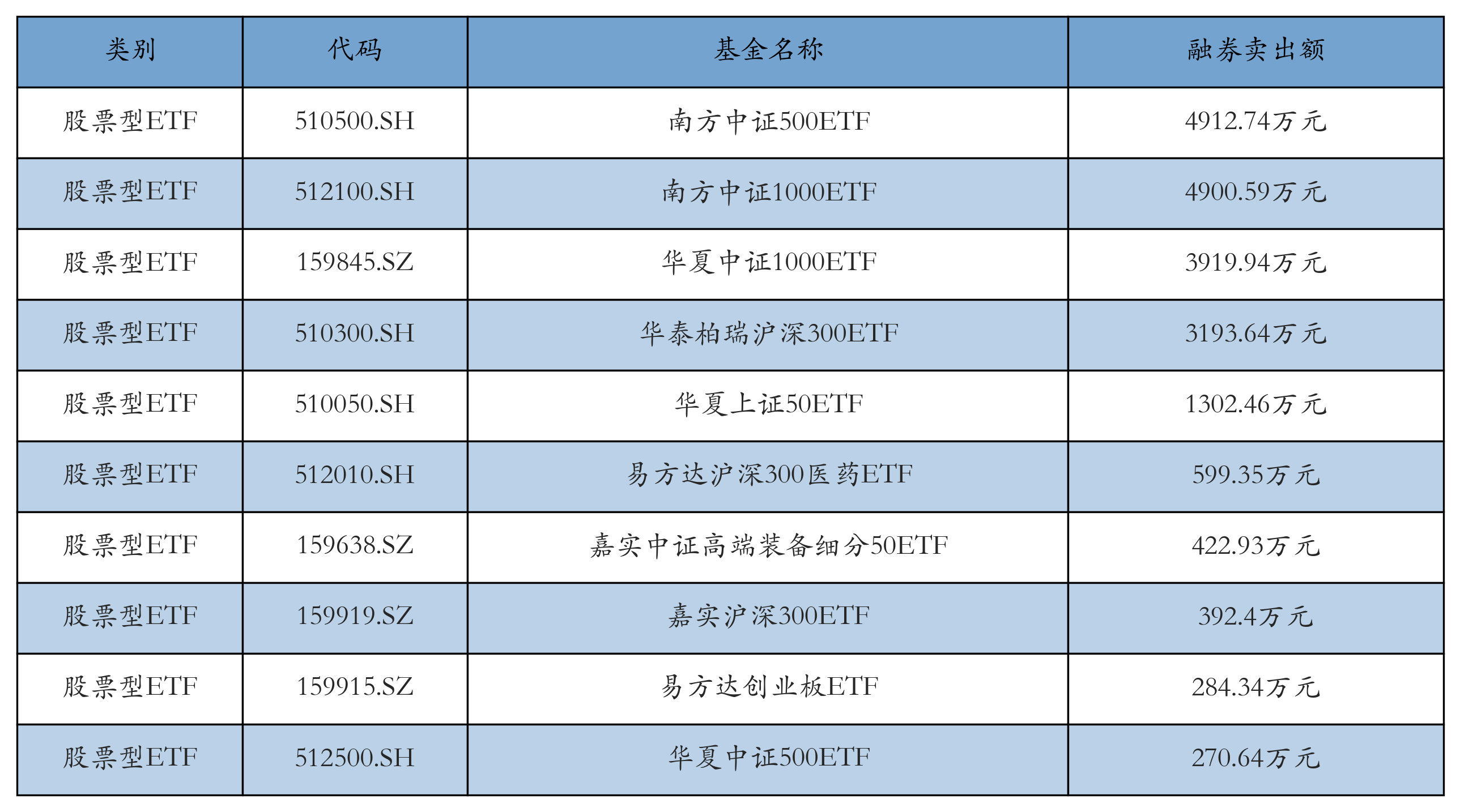昨日股票型ETF融资卖出额最高的3支ETF及其卖出金额分别为:南方中证500ETF(4912.74万元)、南方中证1000ETF(4900.59万元)、华夏中证1000ETF(3919.94万元)。融券卖出额前10详情见下表: