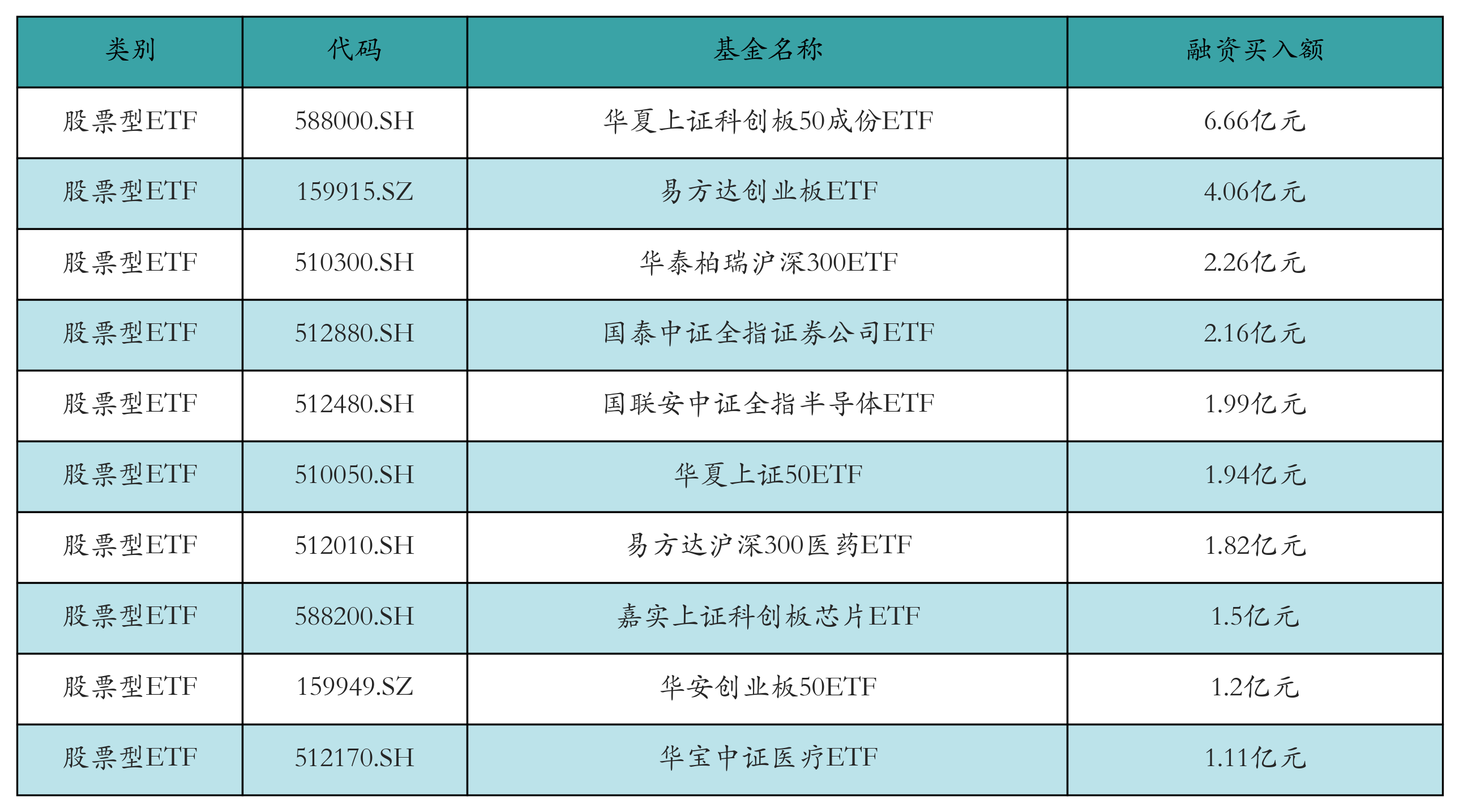 昨日股票型ETF融资买入额最高的3支ETF及其买入金额分别为:华夏上证科创板50成份ETF(6.66亿元)、易方达创业板ETF(4.06亿元)、华泰柏瑞沪深300ETF(2.26亿元)。融资买入额前10详情见下表: