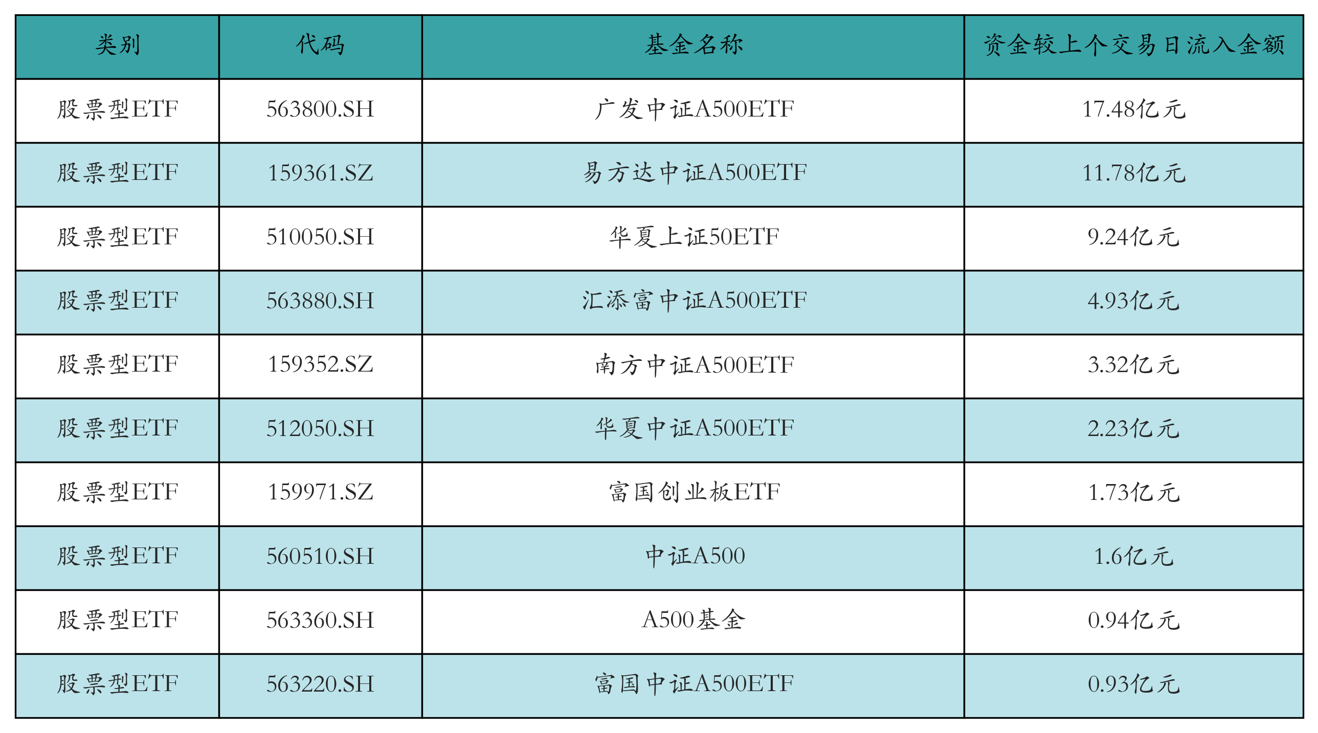昨日股票型ETF资金流入最多的3支ETF及其流入金额分别为:广发中证A500ETF(流入17.48亿元)、易方达中证A500ETF(流入11.78亿元)、华夏上证50ETF(流入9.24亿元)。资金流入前10详情见下表: