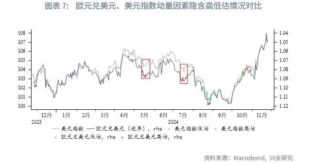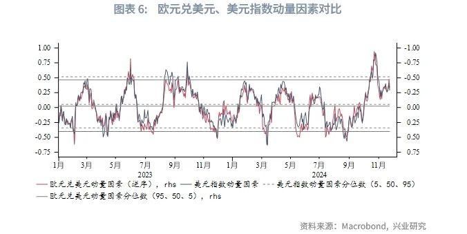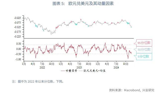 欧债危机后欧央行长期低利率使得以欧元为融资端的套息交易兴起,欧元兑美元受套息因子影响强化。当前美德利差依旧保持在历史高位,套息因子仍有较强影响。降息背景下,价值因素可能将发挥更积极的作用。近年来美元指数的正动量强度更大,反映美元上行趋势更强,可以使用欧元兑美元动量指标辅助判断美元指数的短期高低估。