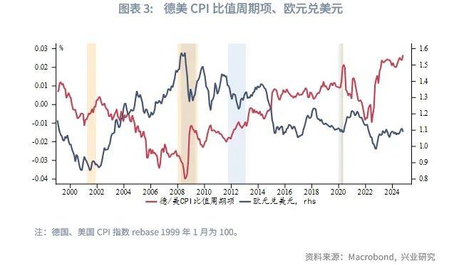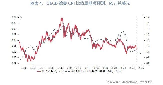 价值因素方面,根据购买力平价理论,如果在一个国家购买某种商品的价格与在另一个国家的价格存在差异,那么双边汇率最终会调整以反映这种差异。我们以德国和美国CPI之比的周期项来描述价值因素对汇率的扰动(拟合效果最佳,优于采用欧元区HICP)。因德国总体增长水平弱于美国,两者CPI之比存在较强单边趋势,所以此处以通过线性方式剔除趋势项后的周期项来刻画购买力平价的影响。长期来看,价值因素对欧元汇率的负面影响大体成立,可以部分解释利差与汇率走势阶段性背离的原因。欧美衰退期(通常与降息周期重叠)内,增长风险之下,非美汇率可能与利差脱敏,价值因素通常占上风。当前降息背景下,价值因素可能将发挥更积极的作用。根据OECD的预测,使用价值因素评估,2025年欧元兑美元中枢或微幅下降。