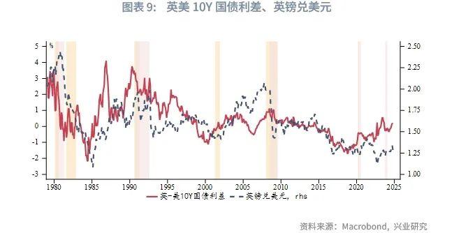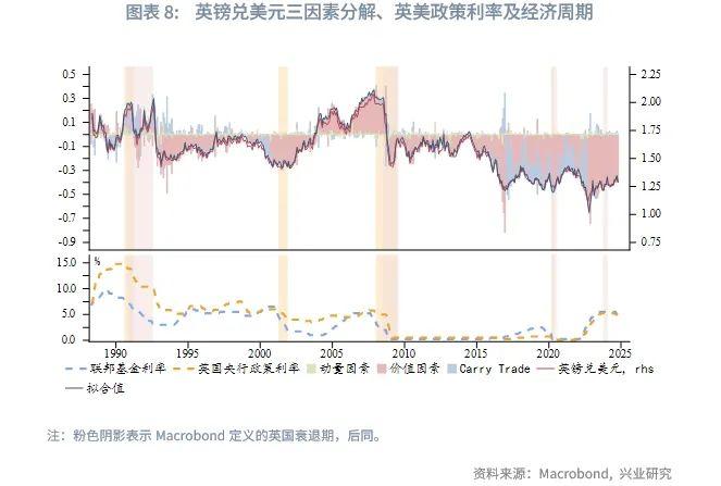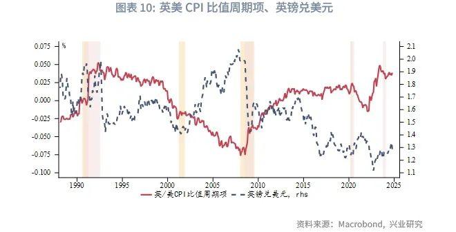 套息因素方面,我们以10年期英国国债与美国国债利差来衡量。上个世纪90年代以来,双方利率存在较强联动(货币属性相似),套息因素影响偏弱。套息因素占主导地位的时期包括:(1)1990年10月至1992年9月,英镑被纳入欧洲汇率机制(ERM)(锚定德国马克),英国央行需要通过调整利率来维持英镑汇率在设定的波动范围内,利率与汇率之间的关系变得更加紧密。(2)英国央行未跟随美联储于2016年进入常规加息通道,维持1%以下的低利率环境一度凸显英镑融资属性,期间套息因素影响加强。随着本轮强势加息周期的启动,英镑兑美元主导因素回归价值因素。