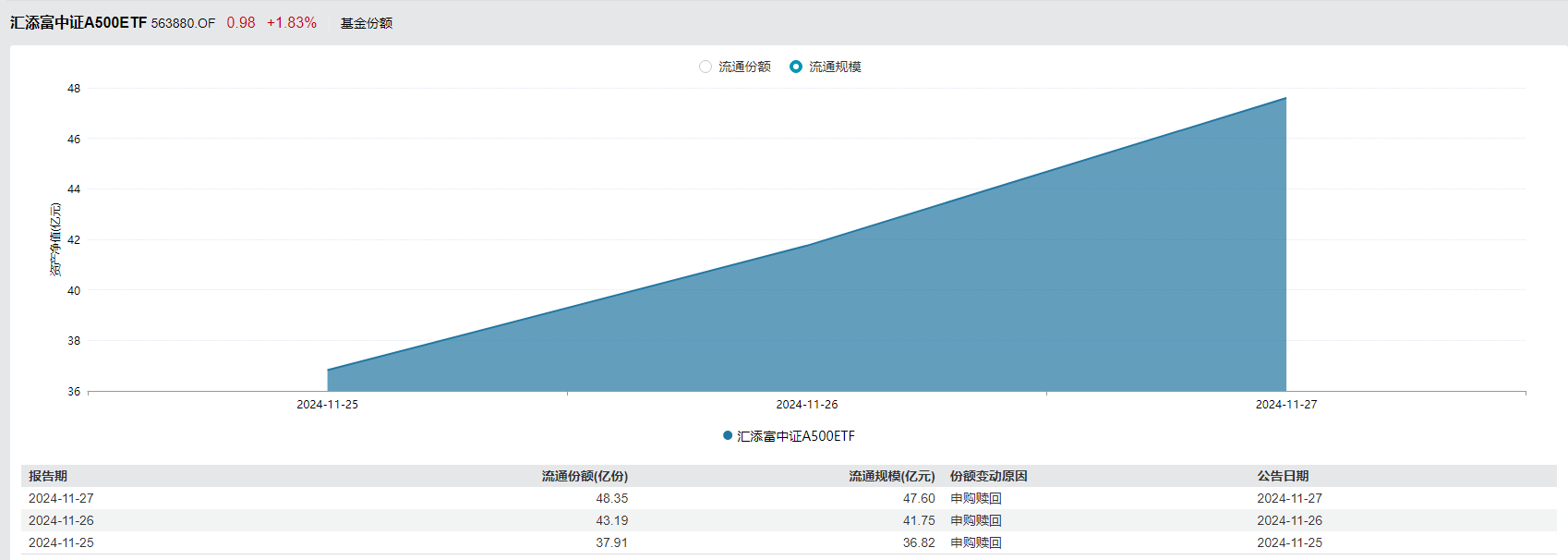 相关ETF方面,中证A500指数ETF(563880)收涨1.55%,全天成交额突破12亿元,换手率达28.66%,连续3日居同标的ETF产品第一。