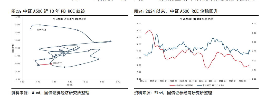 PB-ROE 框架视角下,A500 处于性价比较高区间,具备一定的估值抬升潜力。从盈利能力的维度来看,中证 A500 指数 ROE(TTM)为 9.95,显著高于全A 和全A两非,拐点于 2024年第一季度 确立,当前处在复苏向上区间。从过往季频序列看,近10年来中证 A500 PB 与 ROE 变化同频同向,ROE 向上的区间大多伴随估值抬升。纵向比较,中证 A500 当前处于“低 PB、低 ROE”的双低区间,具备较高的确定性与性价比。