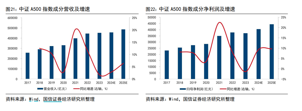 国信证券指出,布局跨年行情,底仓配置A500。中证 A500 指数有望实现收利双增式复苏,2024 年一致预测净利润增速超过9%。从过往数年情况看,中证 A500 指数收入端实现稳步增长,2023 年收入增速下滑至 1.74%,根据万得一致预测值数据,2024、2025 年营收增速分别为2.90%、6.45%。业绩方面,中证A500指数业绩端的砸坑同样出现在2023年,全年业绩增速-1.39%,一致预测口径下 ,2024 年、2025 年预测净利润增速分别达到9.40%、9.69%,相对收入端增长弹性更大。