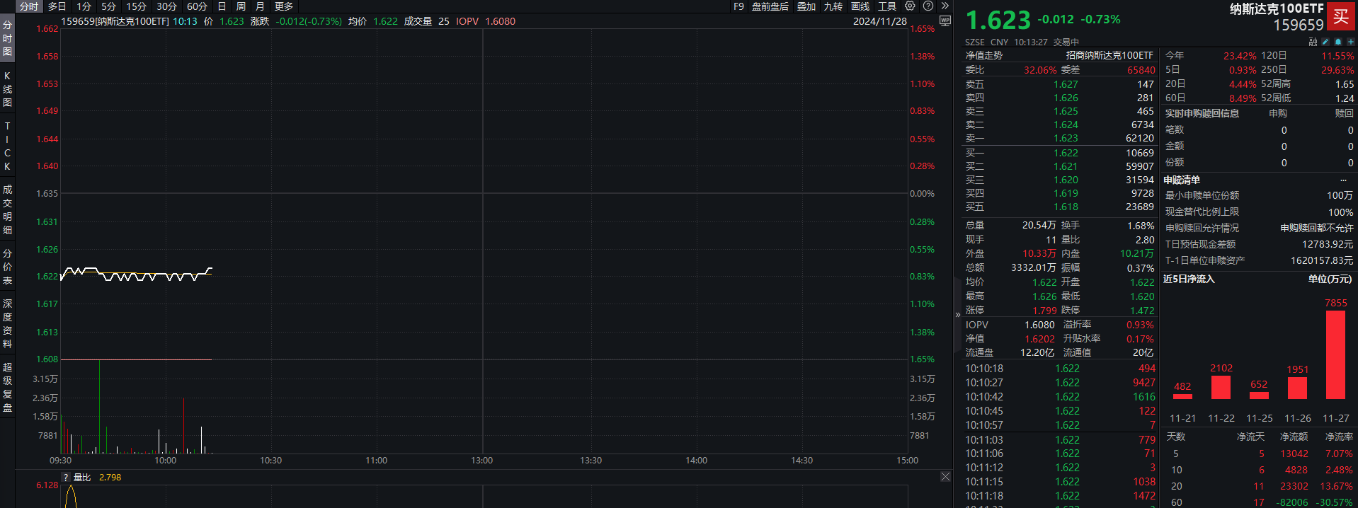 纳斯达克100ETF(159659)截至发稿跌0.73%,换手率1.68%。该基金近期获资金青睐,wind数据显示,截至11月27日,该基金获资金连续5日净流入,累计超1.3亿元,年初以来累计净流入超17.7亿元。该基金年内份额扩容超10亿份,份额变化率为1160.79%。