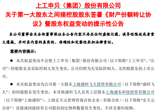 上工申贝称,此次权益变动为公司第一大股东浦科飞人的间接股东发生变化,未导致宏天元合伙直接或间接持有公司股份的比例和数量发生变化。
