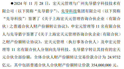 万业企业公告显示,宏天元管理及申宏元管理等11名有限合伙人签署协议,拟分别向先导科技、先导猎宇转让其持有的宏天元合伙全部份额,全体合伙人财产份额转让交易价款合计为24.97亿元。