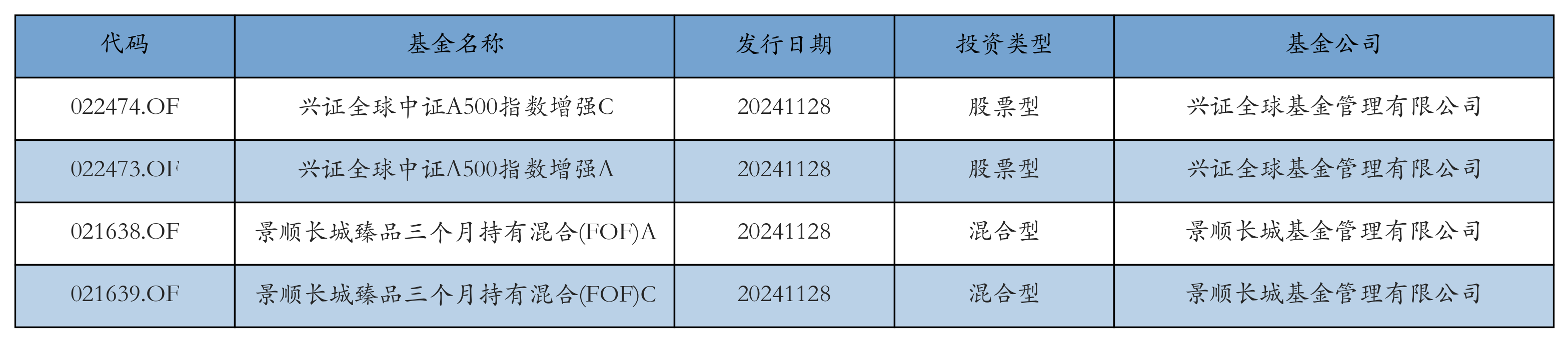 昨日有4只新基金发行,分别为:兴证全球中证A500指数增强C、兴证全球中证A500指数增强A、景顺长城臻品三个月持有混合(FOF)A、景顺长城臻品三个月持有混合(FOF)C,详情见下表: