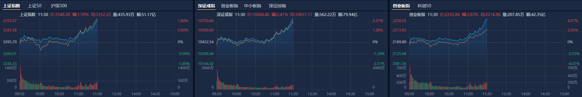 11月29日,市场早盘集体大涨,创业板指领涨。南财金融终端显示,截至午间收盘,沪指涨1.59%,深成指涨2.41%,创业板指涨3.83%。总体上个股涨多跌少,全市场超4500只个股上涨。
