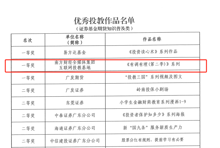 南方财经投教基地出品的《有调有理(第二季)》系列荣获优秀投教作品一等奖(证券基金期货知识普及类),“粤造粤好·云考察”,荣获优秀投教活动二等奖。
