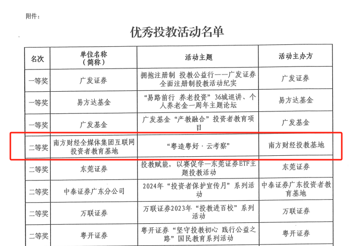 11月27日,广东证监局召开了2024年度辖区优秀投教活动及投教作品表彰大会暨投资者教育工作座谈会。南方财经全媒体集团互联网投资者教育基地荣获“优秀投教作品一等奖(证券基金期货知识普及类)”“优秀投教活动二等奖”两项表彰。