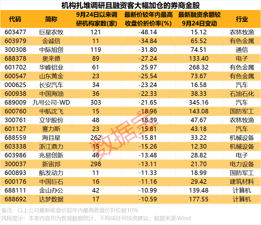 进一步来看,自9月24日至11月29日,融资客加仓超10%,同期获10家以上机构调研,且最新收盘价较年内最高收盘价折价超过10%的公司有20家,主要分布在汽车、有色金属、电子、计算机等行业。