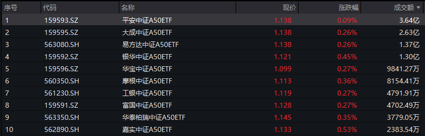 相关ETF方面,截至发稿,中证A50指数ETF(159593)上涨0.09%,成交额超3.6亿元,居同标的ETF产品首位。资金流向方面,Wind数据显示,该ETF已连续4日获资金净流入,累计净流入额超2.3亿元。