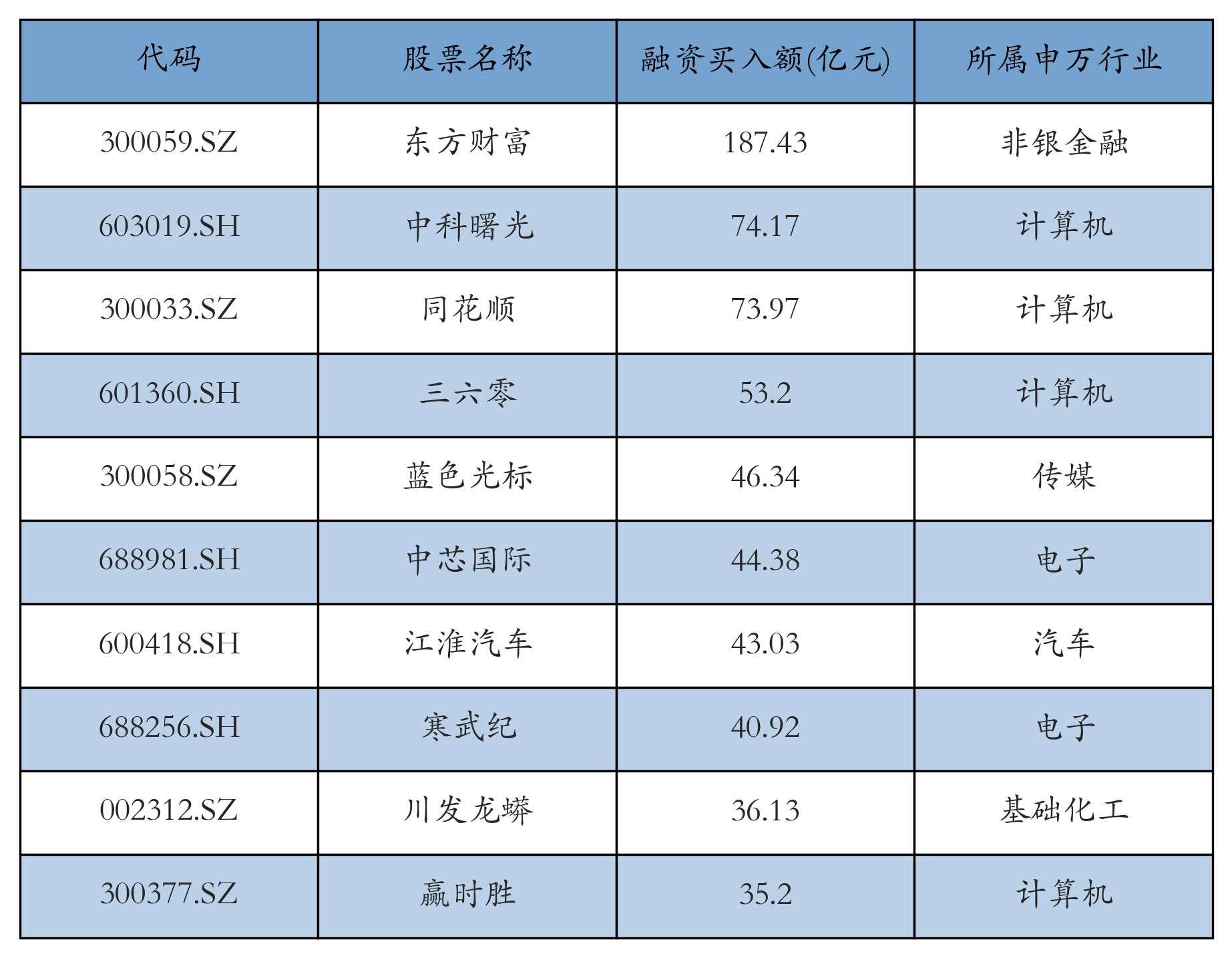 上周两市共有3385只个股有融资资金买入,共有88只个股买入金额超10亿元,其中东方财富、中科曙光、同花顺排名前三,买入金额分别187.43亿元、74.17亿元、73.97亿元。融资买入额前10个股详情见下表: