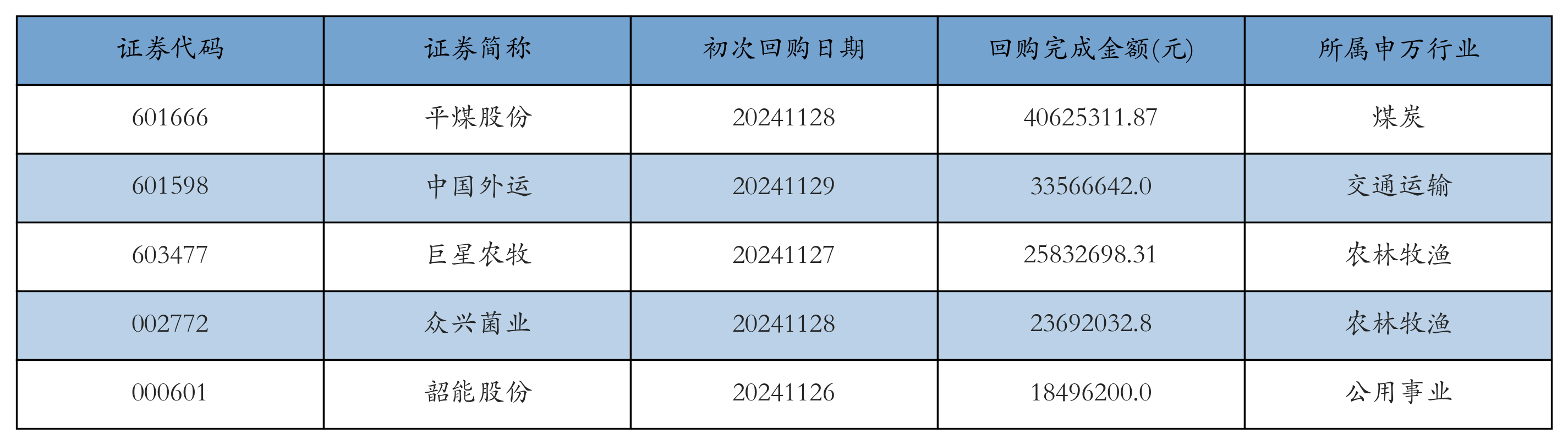 上周共有34条开始执行回购公告,其中执行金额最多的5条公告为: