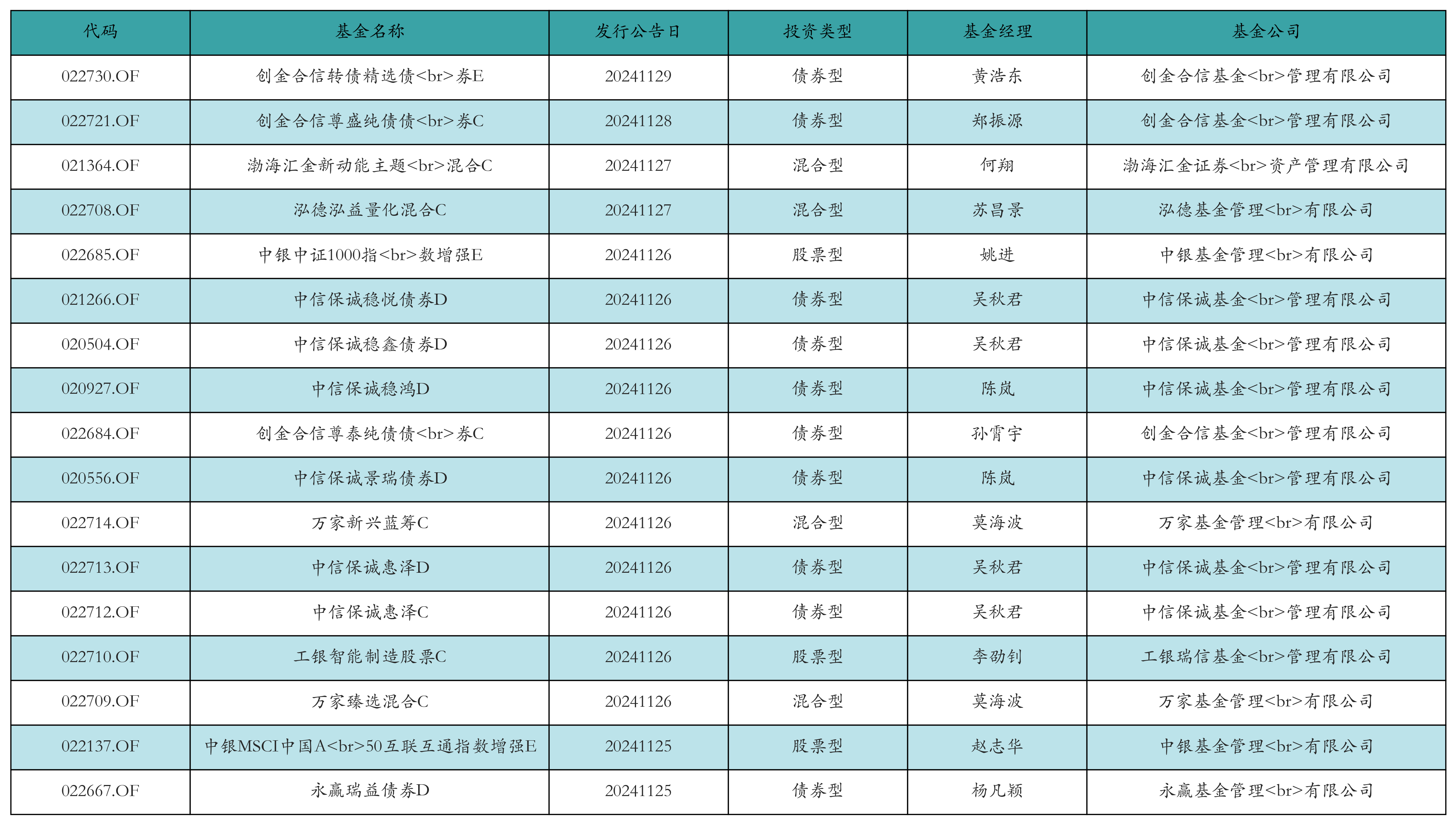 上周有17只新基金发行,分别为:创金合信转债精选债券E、创金合信尊盛纯债债券C、渤海汇金新动能主题混合C、泓德泓益量化混合C、中银中证1000指数增强E、中信保诚稳悦债券D、中信保诚稳鑫债券D、中信保诚稳鸿D、创金合信尊泰纯债债券C、中信保诚景瑞债券D、万家新兴蓝筹C、中信保诚惠泽D、中信保诚惠泽C、工银智能制造股票C、万家臻选混合C、中银MSCI中国A50互联互通指数增强E、永赢瑞益债券D,详情见下表: