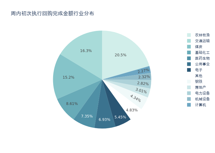 按照初次执行金额所在不同行业分布,金额最高的3个行业分别为:农林牧渔、交通运输、煤炭,详情见下图: