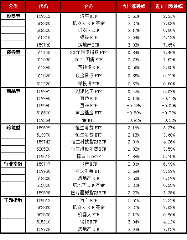 从不同投资种类、行业、主题的ETF产品中找出今日走势行情排名前5的ETF基金,根据Wind数据,今日涨幅靠前的ETF产品如下表所示。股票型ETF中涨幅最高的3只ETF产品分别为汽车ETF(159512)、机器人ETF基金(562360)、机器人ETF(562500),今日收益率分别为5.51%、3.27%和3.17%。