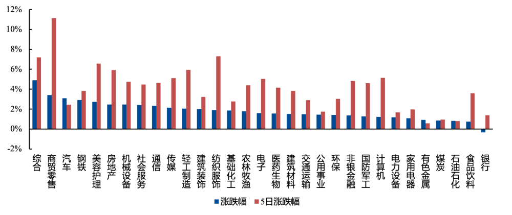 统计全部申万一级行业今日涨跌幅情况,综合、商贸零售、汽车今日走势排名靠前,日涨跌幅分别为4.91%、3.4%和3.09%;石油石化、食品饮料、银行的走势排名靠后,日涨跌幅分别是0.81%、0.74%和-0.34%。近5个交易日商贸零售、纺织服饰、综合的走势排名靠前,近5日涨跌幅分别为11.14%、7.30%和7.19%;煤炭、石油石化、有色金属行业的走势排名靠后,近5日涨跌幅分别为0.95%、0.79%和0.58%。