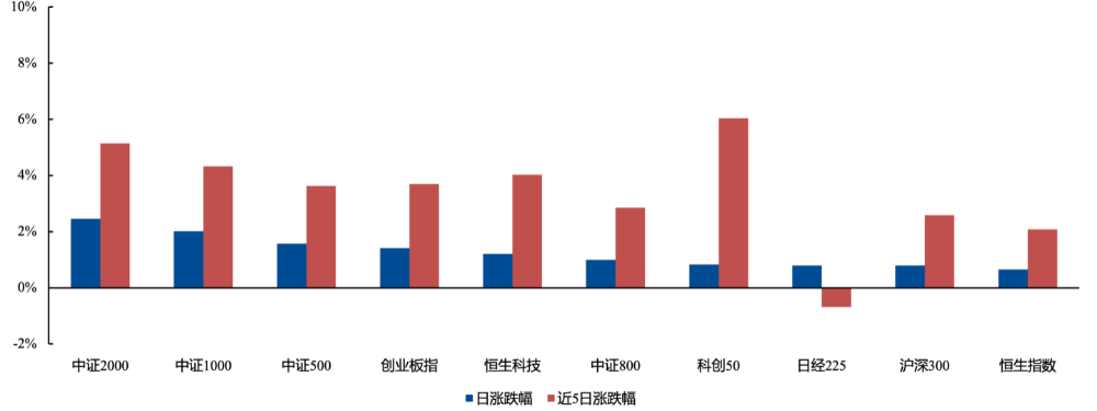 今日中证2000、中证1000、中证500走势排名靠前,日涨跌幅分别为2.45%、2.01%和1.57%;近5个交易日科创50、中证2000、中证1000的走势排名靠前,近5日涨跌幅分别为6.04%、5.15%和4.32%。