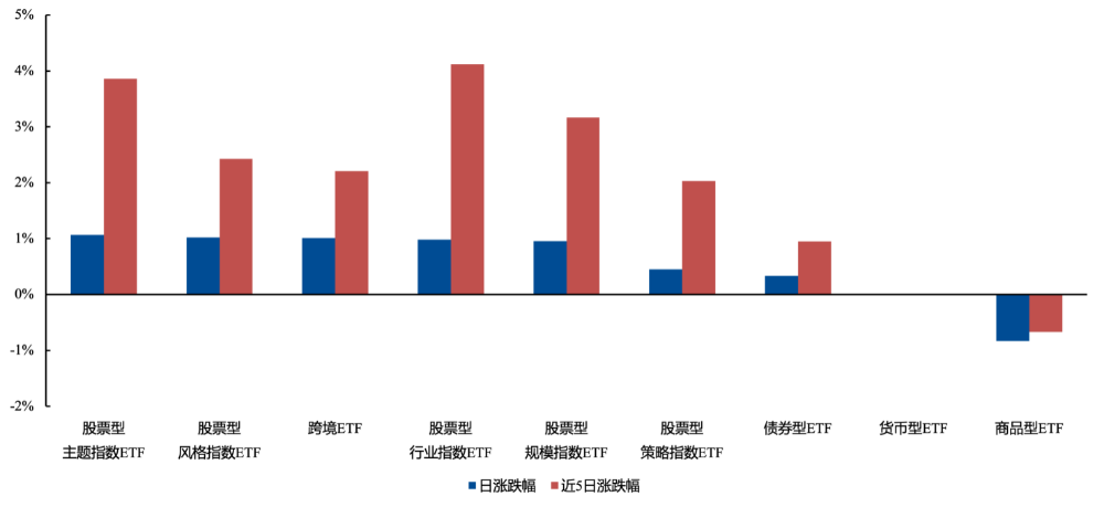 根据ETF基金的规模和涨跌幅计算得出不同分类情况下各类ETF基金的加权平均涨跌幅。