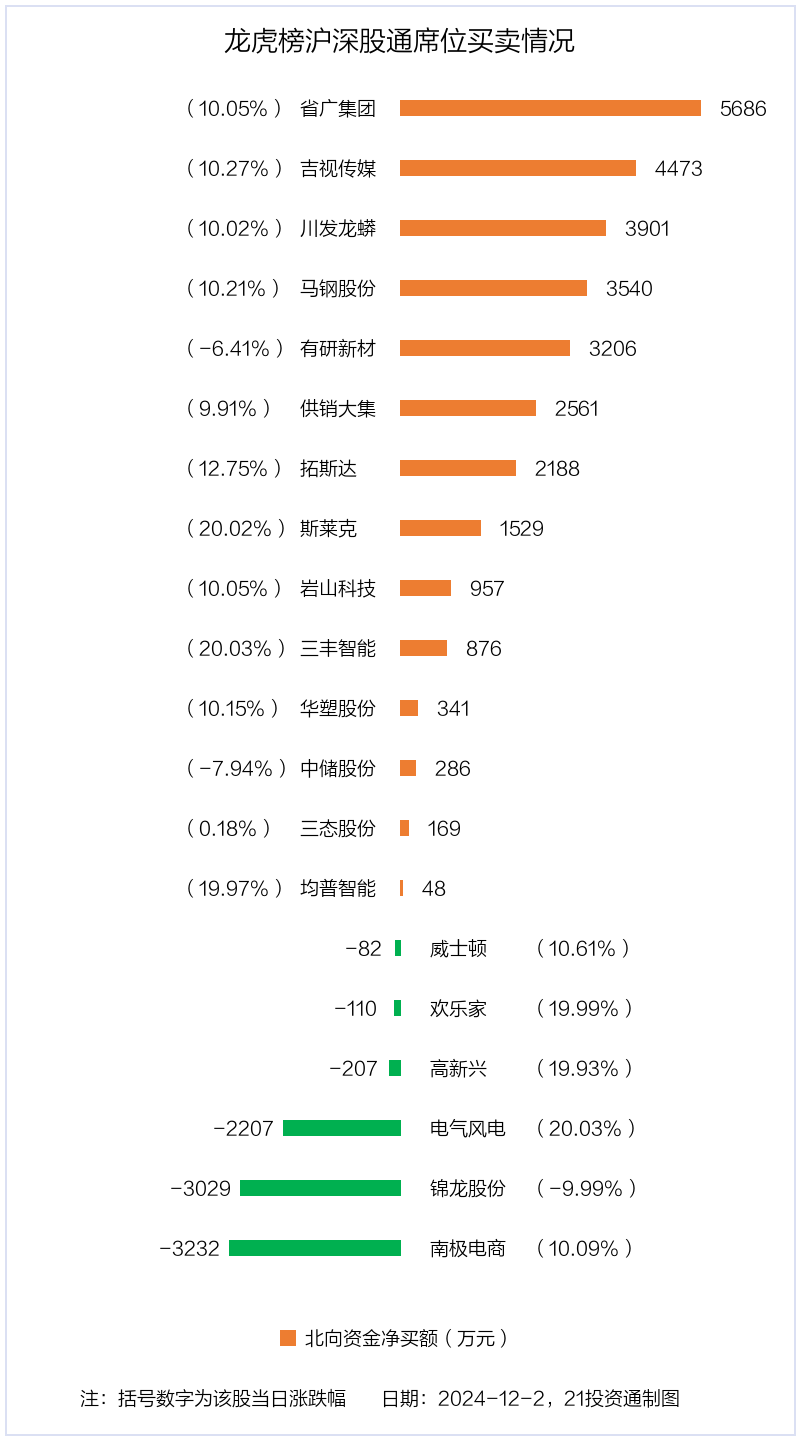 12月2日,北向资金参与龙虎榜中的个股共有20只,合计净买入2.09亿元。其中沪股通净买入6 股,净卖出1 股,合计净买入9686.54万元;深股通净买入8 股,净卖出5 股,合计净买入1.12亿元。