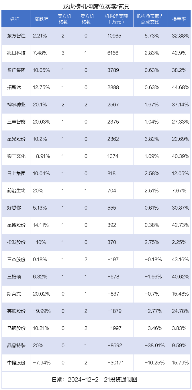 其中,机构净买入金额最多的是东方智造(002175.SZ),当日收盘上涨2.21%,换手率为32.88%。