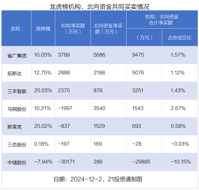 值得注意的是,机构和北向资金共同净买入了省广集团、拓斯达、三丰智能等3股;在马钢股份,斯莱克,中储股份,三态股份上出现分歧,机构净卖出马钢股份1997.08万元,北向资金净买入3540.18万元;机构净卖出斯莱克836.5万元,北向资金净买入1529.3万元;机构净卖出中储股份3.02亿元,北向资金净买入285.81万元;机构净卖出三态股份197.43万元,北向资金净买入169.16万元。