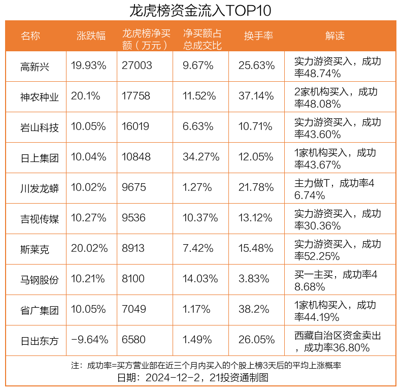 12月2日,上证指数上涨1.13%,深证成指上涨1.36%,创业板指上涨1.42%。盘后龙虎榜数据显示,共有59只个股因当日异动登上龙虎榜,资金净流入最多的是高新兴(300098.SZ),达2.7亿元。