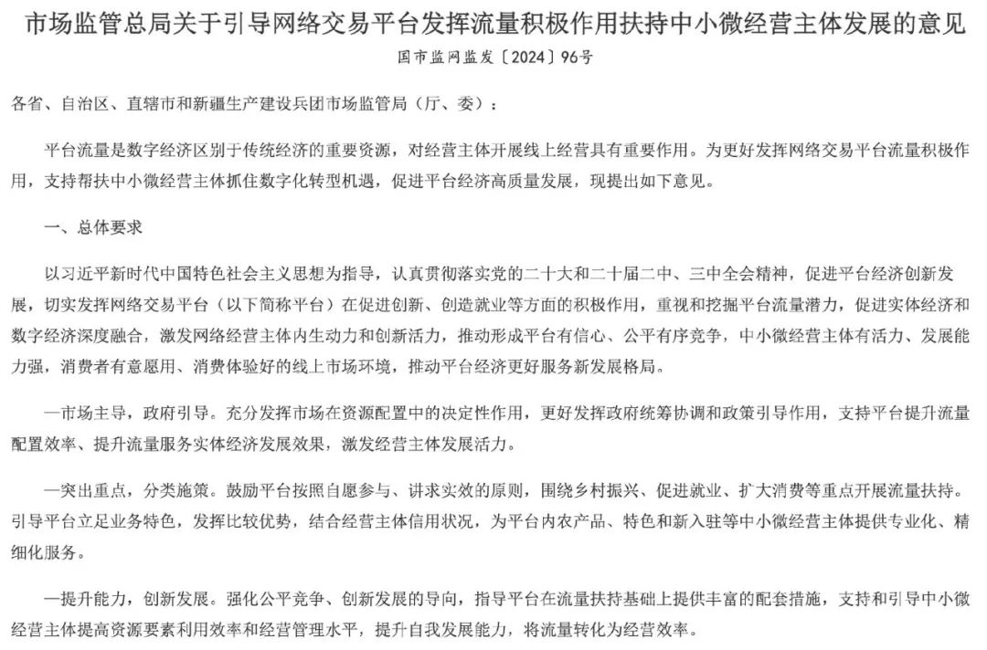 市场监管总局在近期出台《关于引导网络交易平台发挥流量积极作用扶持中小微经营主体发展的意见》(以下简称“意见”)。