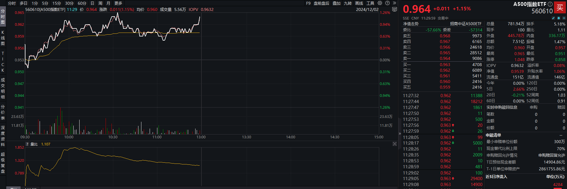 相关ETF方面,A500指数ETF(560610)早盘震荡走高,交投活跃。截至午间收盘上涨1.15%,成交额达7.51亿元,换手率达5.18%,溢折率0.08%。据Wind11月29日数据,该ETF最新流通规模超144亿元,最新流通份额超151亿份。成分股方面,岩山科技、川能动力等4股涨停,天孚通信、千方科技等股涨幅居前。